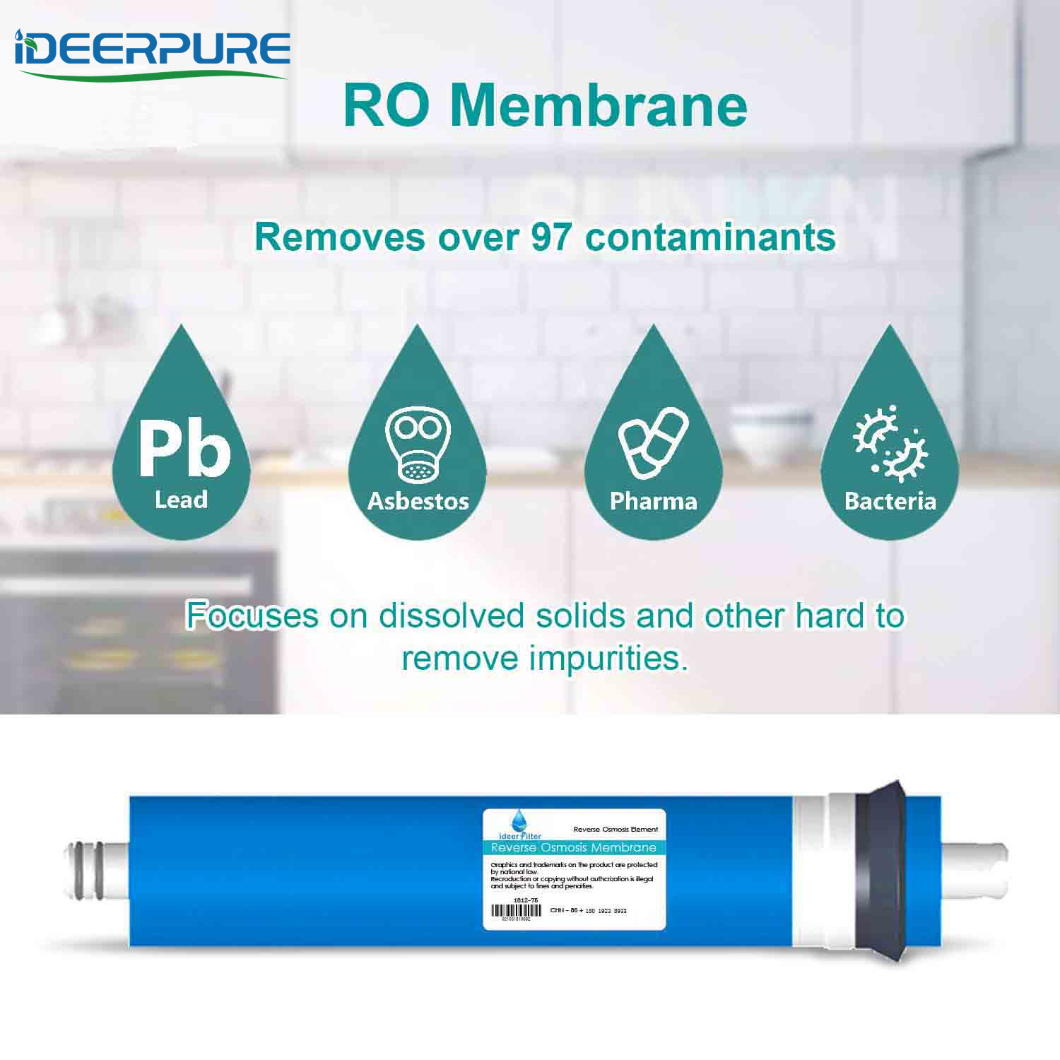 Reverse Osmosis Membrane effective in reducing hardness, heavy metals, toxins, free chlorine, bad taste, odor THM, Organics, hazardouschemicals, and pesticides. Depending on inlet water quality or flow rate, it needs to be replaced every 24 months or 36,000 gallons of water.